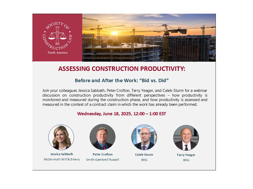 Join the Society of Construction Law North America (Southeastern Chapter) for a panel discussion on construction productivity from different perspectives – how productivity is monitored and measured during the construction phase, and how productivity is assessed and measured in the context of a contract claim in which the work has already been performed.