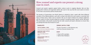 The Society of Construction Law North America is pleased to host a panel with three different members of the Alberta judiciary, each with a unique role within the court system, to provide their input on these issues. Topics such as trends in the use of expert evidence for summary judgment, and the extent to which counsel should be involved in preparing expert reports will be discussed. This presentation will provide practical tips for both counsel and expert witnesses to ensure they are putting their best foot forward in court.