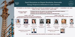 The SCL NA Tri State Chapter welcomes you to attend a double panel event at the offices of McDermott Will & Emrey in New York on September 24, 2024 at 4.30pm. The first panel will focus on the evolving Latin American Arbitration Landscape in Construction Disputes and the second panel will focus on Dispute Resolution in the Renewable Energy Sector. Each panel will include lawyers and experts with relevant international practical experience.