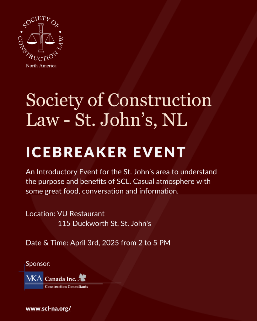 This networking event will introduce SCL and local members to the local contractor, consultant and legal communities. This afternoon event will take place in St. John’s from 2-5 p.m. Newfoundland time, and will feature finger foods, drinks, short presentations, and open floor discussions.